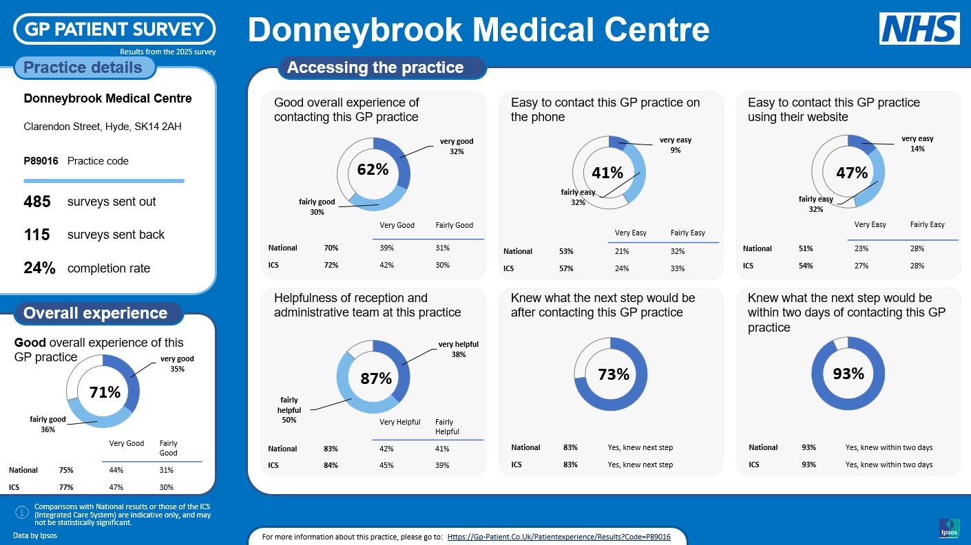 The Patient Survey results were published on July 10th 2025. We are pleased to publish our patient results for 2025. Out of 485 forms sent out to patients, 115 were returned with a 24% uptake. The practice is currently sending out surveys so we can collect our own patient feedback. This will be published once we have reviewed all the responses.